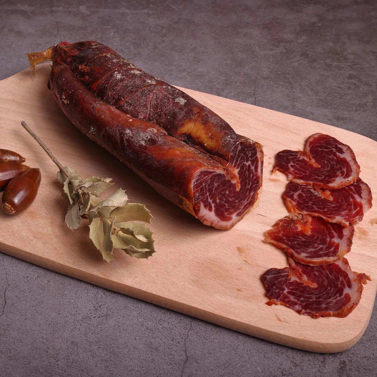 Elaborada con carne de cerdo ibérico de bellota, esta caña de lomo destaca por su textura tierna, sabor delicado y aromas equilibrados. Curada lentamente por artesanos, ofrece una experiencia gastronómica única. Sobre de 80 gramos.